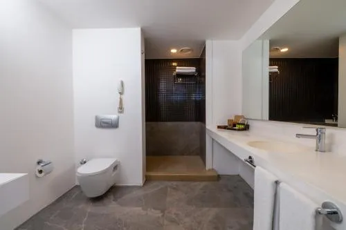 Dimensiuni: 56 mp Numar de camere: 10 camere Family Suite rooms have 1 bedroom (1 french bed), 1 living room (sofa that can be used as a bed), 1 or 2 bathrooms and 2 LED TVs. With balconies and side sea views, these rooms have all equipment that complies with the 5 Star Deluxe norms. Baie privată cu duș