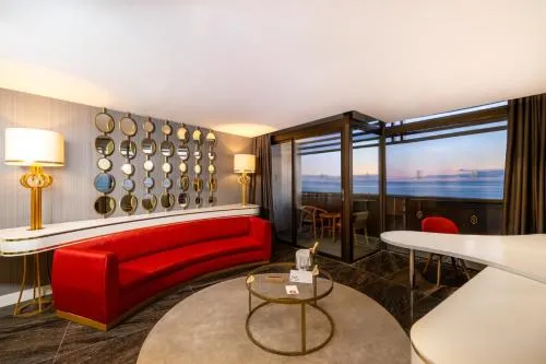 Dimensiuni: 70 mp Numar de camere: 6 camere Deluxe Suite rooms have 1 bedroom (1 french bed + 1 sofa), 1 bathroom and 2 LED TVs. With balconies and sea/side sea views, these rooms have all equipment that complies with the 5 Star Deluxe norms.