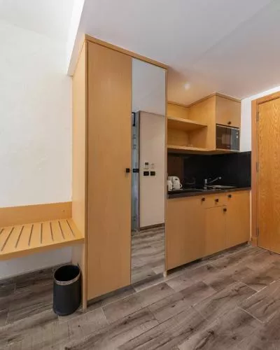 Dimensiuni: 35 mp Numar de camere: 1 camera The air-conditioned suite features 1 bedroom and 1 bathroom with a shower and a hairdryer. The well-fitted kitchenette has a stovetop, kitchenware, a microwave and a tea and coffee maker. Featuring a terrace with mountain views, this suite also offers a minibar and a flat-screen TV with satellite channels. The unit offers 1 bed. Baie privată cu duș
