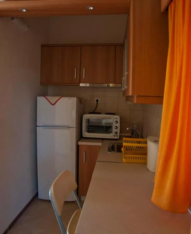 Bucătărie: Frigider Plită de gătit Cuptor Ustensile de bucătărie Chicinetă Vedere: Vedere la mare General : Pardoseală de gresie/marmură Izolare fonică Aer condiţionat Baie: Toaletă Duş Baie privată Exterior: Terasă Zonă de living: Zonă de luat masa