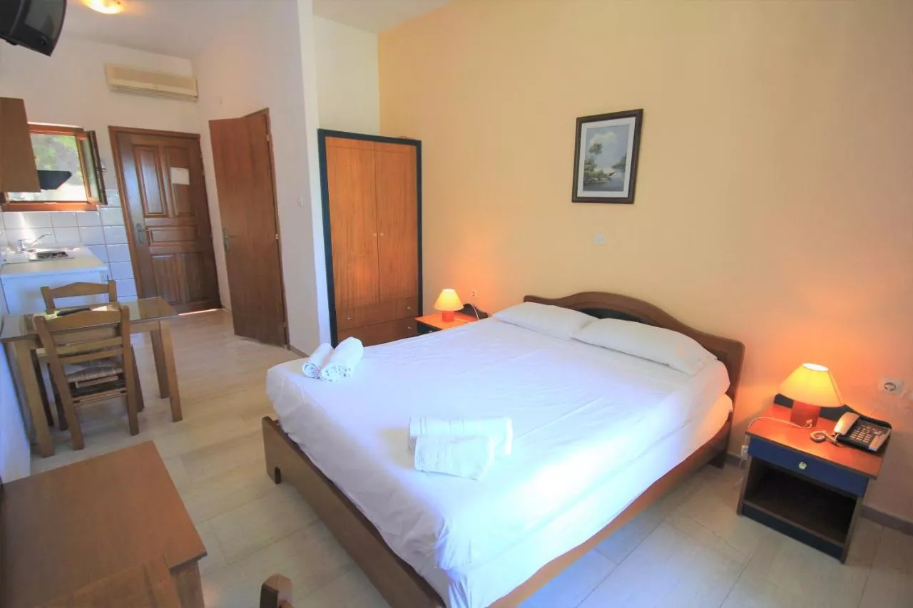 Studiourile și apartamentele de la Hotelul Delphi se deschid către un balcon sau o terasă privată cu vedere la mare sau la grădină. Fiecare este dotat cu aer condiționat, un televizor și un frigider mini.