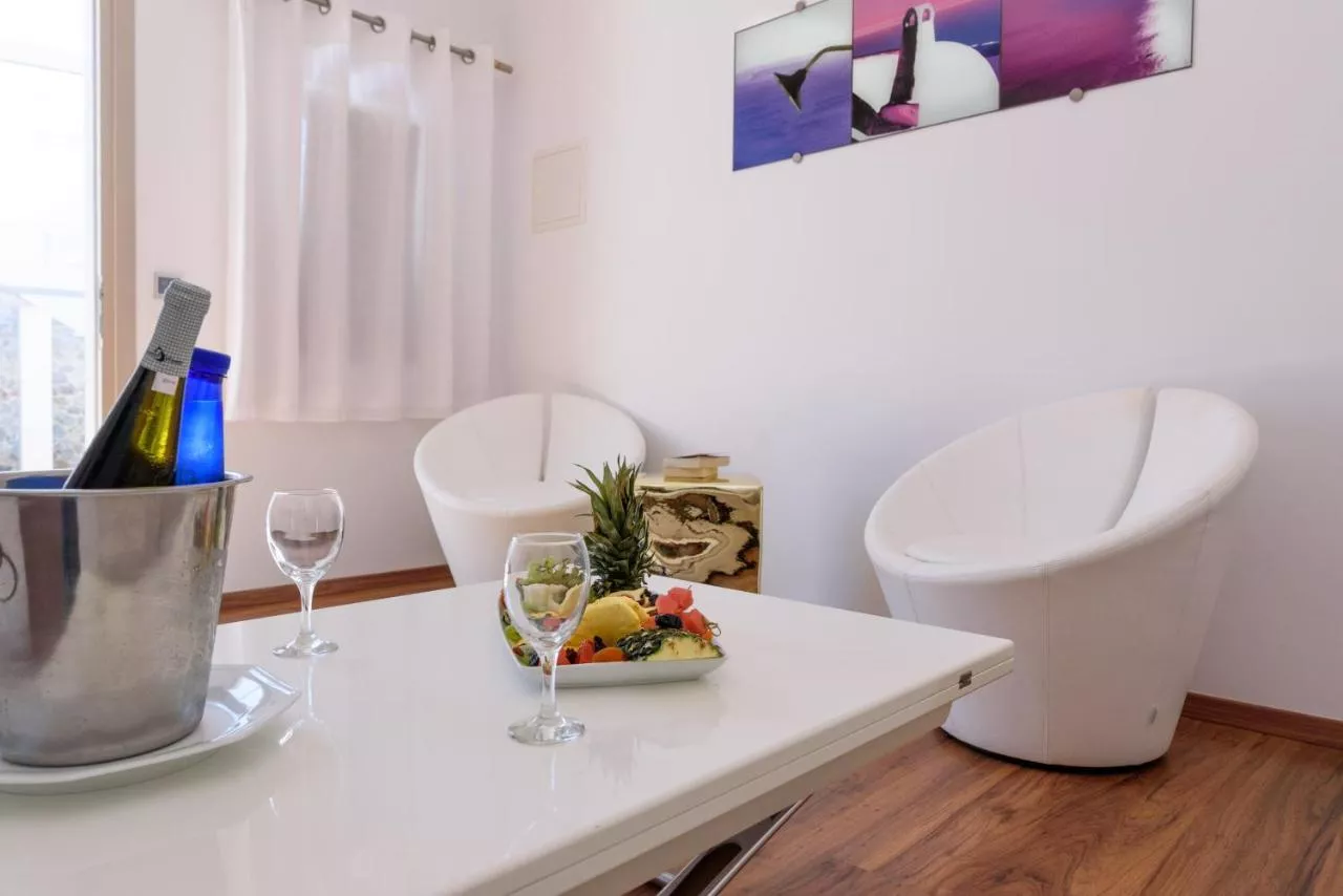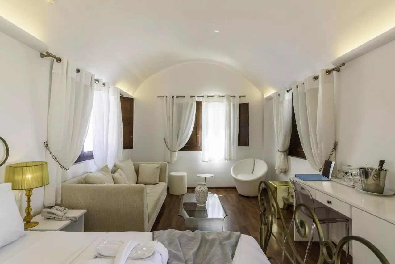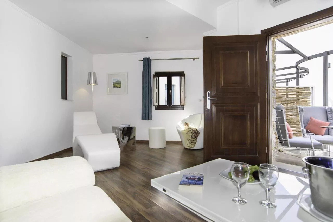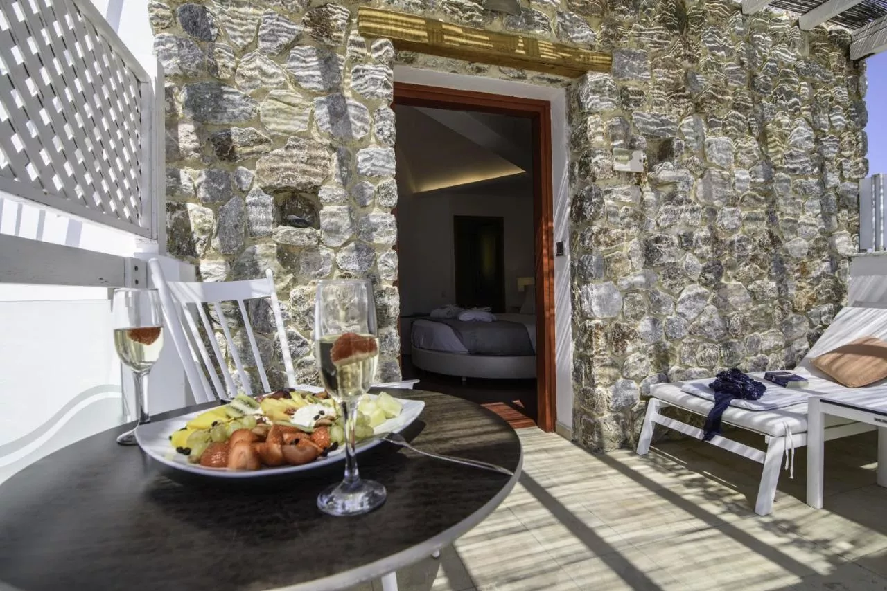 Camerele elegante combină elemente tradiționale cicladice cu caracteristici moderne, cum ar fi un televizor cu ecran plat cu player CD/DVD și Wi-Fi gratuit. Toate camerele sunt dotate cu cadă sau duș cu hidromasaj.