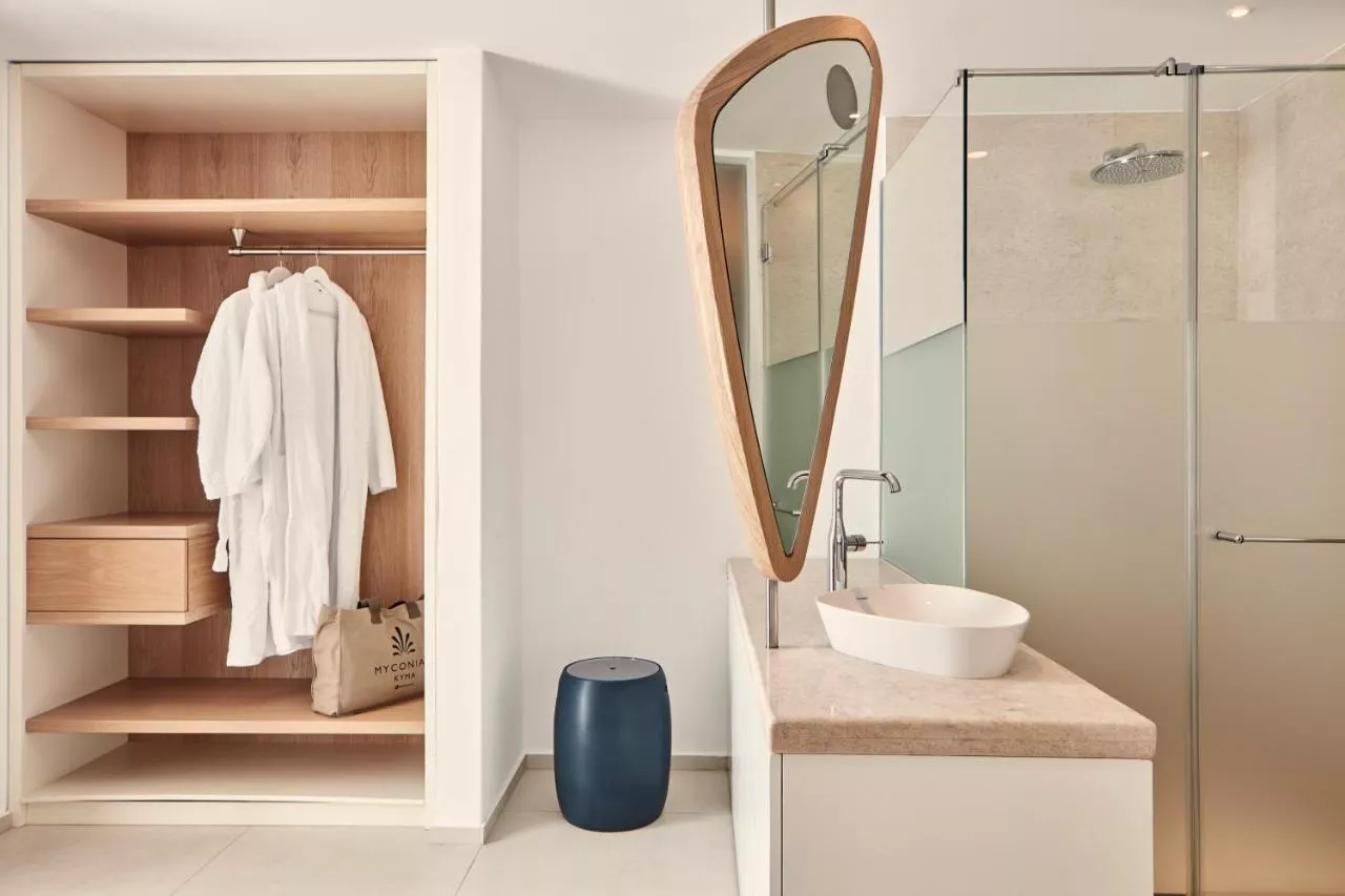 Camerele și suitele de la Kyma urmează liniile drepte și curbele arhitecturii cicladice. Unele dintre ele au propriul lor bazin privat cu vedere la mare, iar toate sunt dotate cu televizor prin satelit, minibar, papuci și produse de toaletă gratuite.