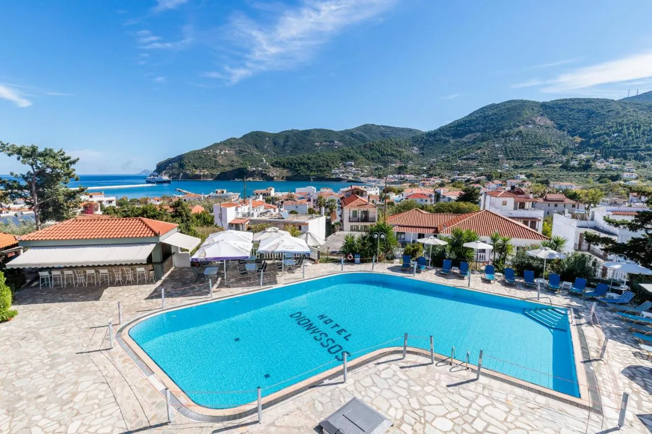 Oferind o adevărată mostră de design arhitectural tradițional, Hotelul Dionyssos dispune de o terasă spațioasă cu scaune de bambus, cu vedere la piscina mare, la taverna și barul de la piscină, precum și la frumosul golful Skopelos.