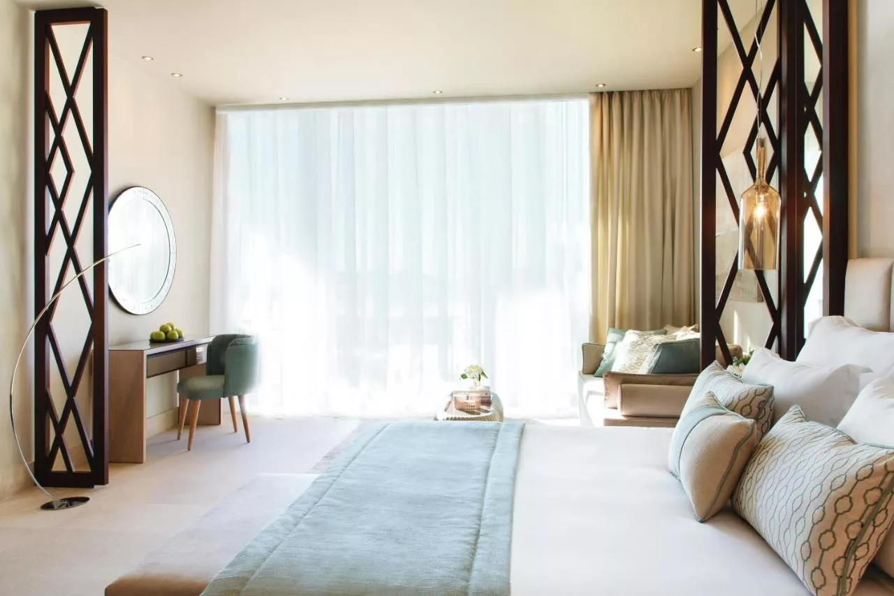Dimensiuni: 39 mp Numar de camere: 10 camere Suită cu 1 dormitor și balcon mare, în clădire cu regim mic de înălțime, care asigură confort și design modern. Ferestrele panoramice oferă vedere la grădinile luxuriante și la piscine. În cameră pot fi cazați cel mult 3 adulți. Baie privată cu cadă