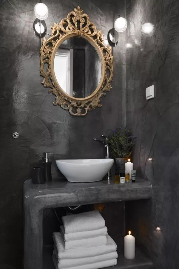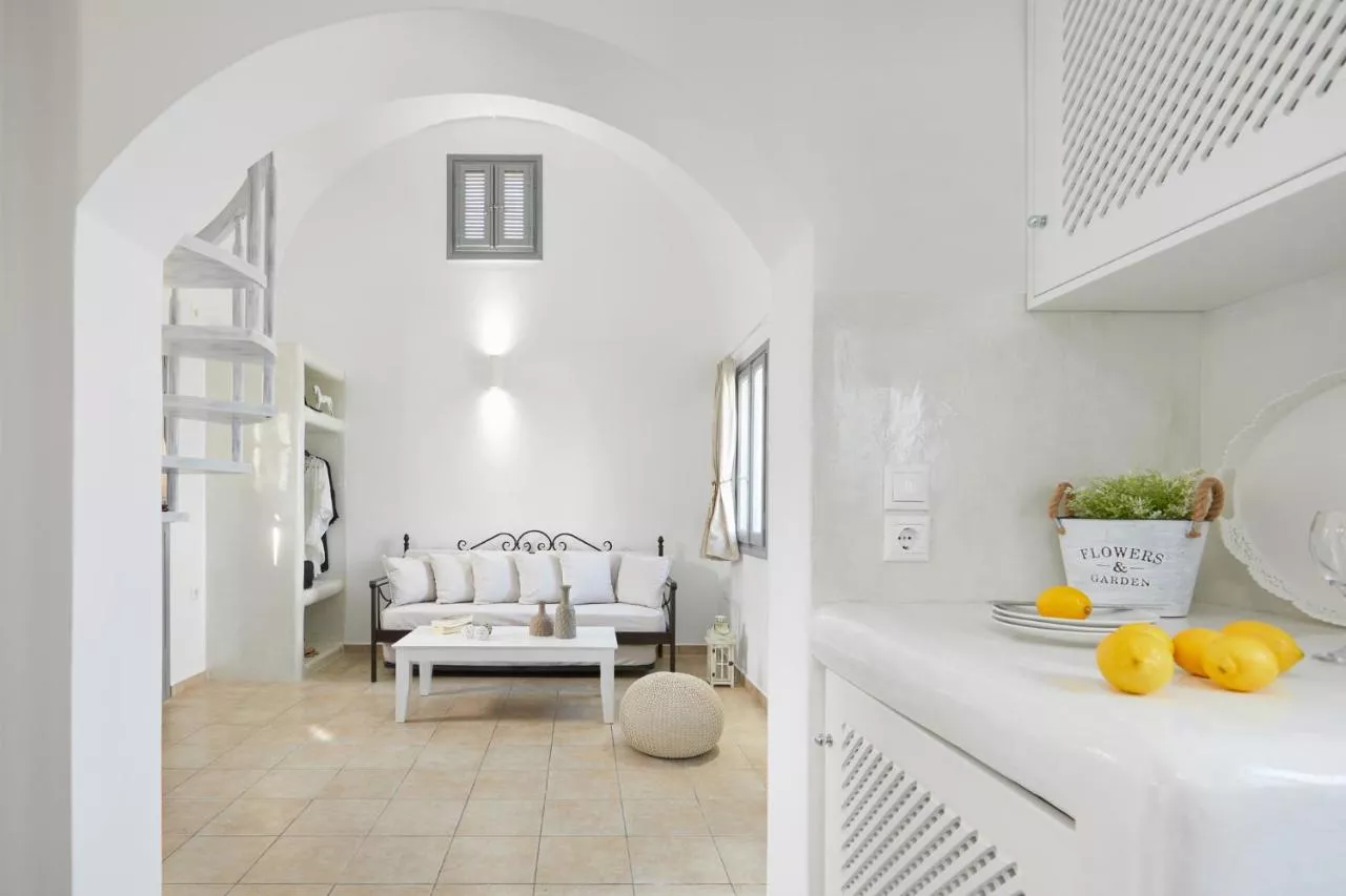 Reședința tradițională în culori albastre și albe, construită în conformitate cu stilul arhitectural cicladic, se bucură de priveliști la răsărit.