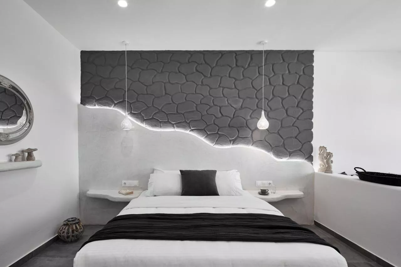 Fiecare unitate cu două etaje și cu aer condiționat dispune de un mini-frigider și un televizor. Aceasta are o baie cu duș și un balcon cu vedere panoramică la Marea Egee.