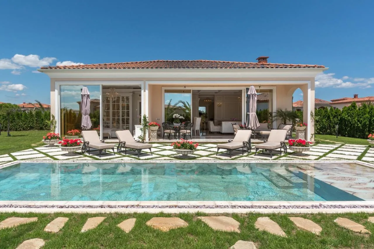 Dimensiuni: 270 mp Numar de camere: 1 camera This larger villa is air-conditioned and features a spacious living room with a fireplace, seating area and a flat-screen TV. There is a fully equipped kitchen with a dishwasher and other modern facilities. Featuring a shower, private bathroom also comes with a bathtub, bidet, bathrobes, slippers and free toiletries. There is an additional bathroom in each villa. You can enjoy garden view with a swimming pool from the rooms. A washing machine, a tumble dryer and cleaning products are provided.