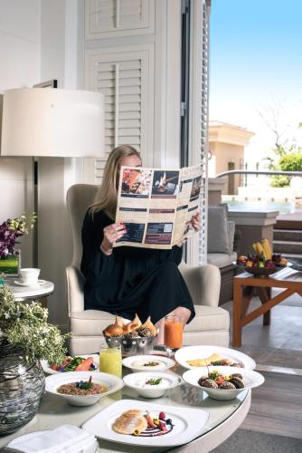 Dimensiuni: 46 mp Numar de camere: 10 camere Această cameră are decor cald şi primitor, oferind vedere la piscină sau la centrul comercial Mall of the Emirates. Include o zonă de lounge confortabilă şi o baie spaţioasă cu marmură cu o chiuvetă dublă, toaletă separată, bideu, cadă şi duş separat. Această cameră oferă acces la internet wireless de mare viteză, TV cu ecran plat, DVD player, seif în cameră, mini-bar, facilități pentru prepararea de cafea și ceai în cameră, precum și o cămară de serviciu. Baie privată cu cadă