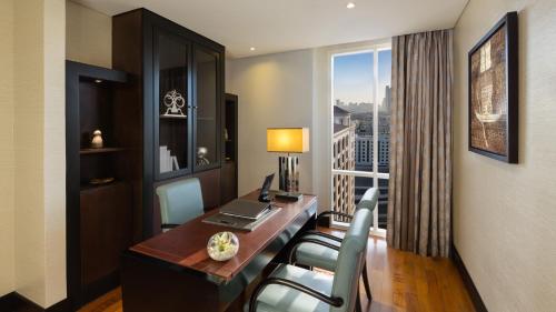 Dimensiuni: 61 mp Numar de camere: 5 camere Executive Grand Deluxe room have access to the Executive Lounge and includes Breakfast. They are highlighted by a perfect blend of modern contemporary décor and distinctive Arabian design that offer guests a generous space and comfort environment with a separate dining, study and living room area. Guests can enjoy the latest blockbusters on the two 46-inch TV screen and feast on delights from the in-room dining menu. A beautiful and large, fully marbled bathroom with luxurious bath amenities, deep soaking tub and a separate walk-in shower with a rain forest shower head confer an ambiance of luxurious exclusivity, enhanced by a wealth of special in-room amenities.