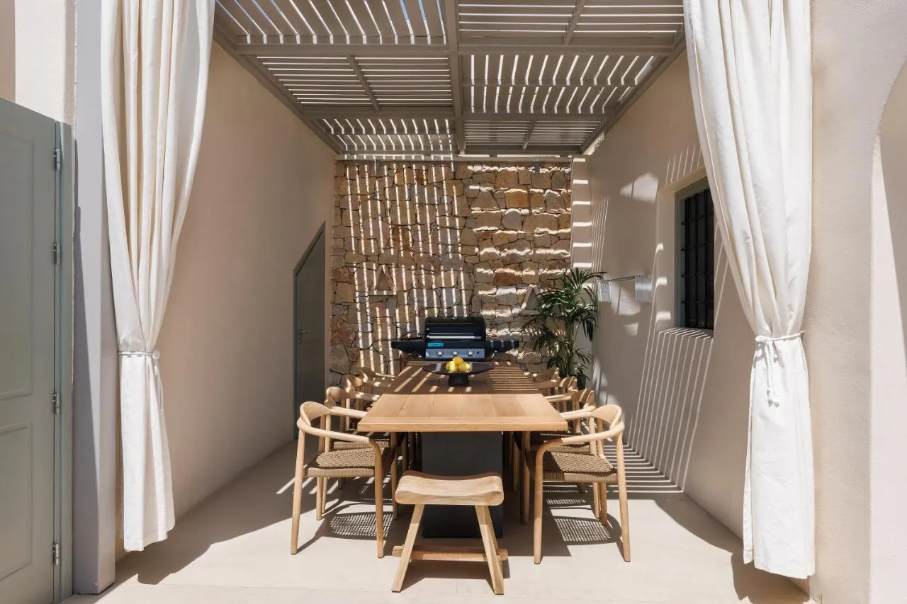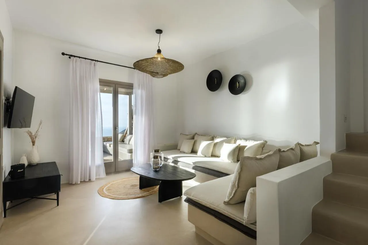 Dimensiuni: 180 mp Numar de camere: 1 camera Offering more space, this minimally decorated villa features a private pool with hydromassage jets and an outdoor dining area and 4 sun beds. Overlooking the Aegean Sea, it includes: