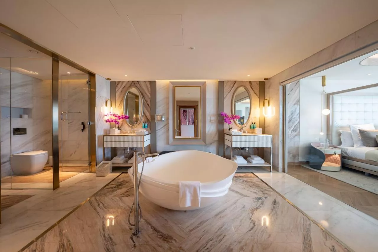 Dimensiuni: 272 mp Numar de camere: 1 camera Atracția acestei suite este cada cu hidromasaj. Suita are intrare privată, aer condiționat, cameră de zi, 1 dormitor separat și 2 băi cu duș tip walk-in și cadă. De asemenea, această suită spațioasă are minibar, aparat de ceai și cafea, zonă de relaxare, TV cu ecran plat cu servicii de streaming, precum și vedere la mare. Unitatea de cazare include 1 pat. Baie privată cu cadă