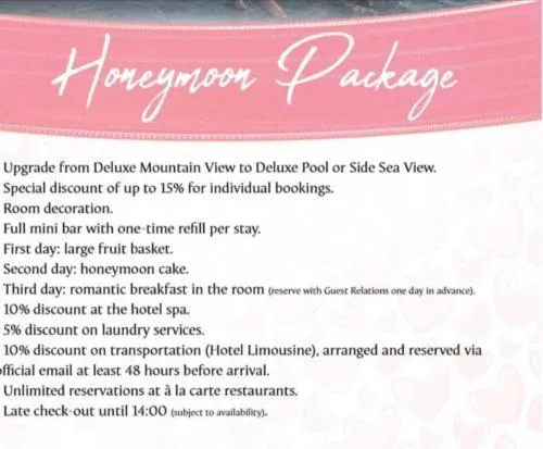 General : Seif pentru laptop Seif Intrare privată Aer condiţionat Bucătărie: Masă Cană fierbător Uscător de haine Produse de curățenie Accesibilitate: Etaje superioare accesibile cu liftul Media/Tehnologie: TV cu ecran plat TV Telefon Servicii: Serviciu de trezire Vedere: Vedere la munte Vedere la oraș Zonă de living: Canapea Zonă de relaxare Zonă de luat masa Baie: Prosoape Articole de toaletă gratuite Papuci de casă Uscător de păr Toaletă Duş Hârtie igienică Baie privată Exterior: Terasă Patio Balcon Facilităţile camerei: Priză lângă pat Canapea extensibilă Mâncăruri și băuturi: Aparat pentru prepararea de ceai/cafea Minibar Dormitor: Lenjerie de pat Dressing Garderobă sau dulap
