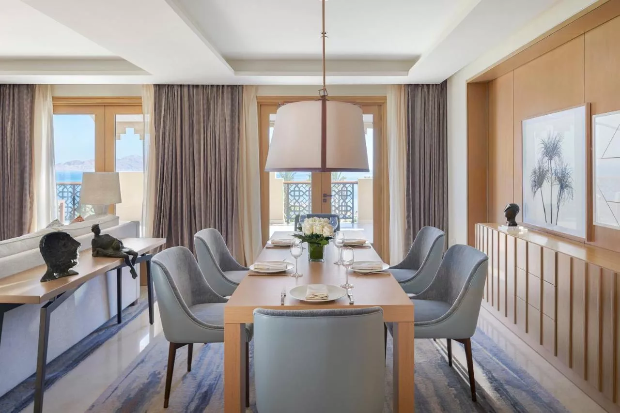 Dimensiuni: 255 mp Numar de camere: 2 camere Beneficiind de piscină privată de dimensiuni standard, cu vedere la Marea Roșie, această suită spectaculoasă cu 2 dormitoare oferă cele mai recente elemente de lux Four Seasons, inclusiv decor modern elegant și tehnologie de ultimă generație. Din foaierul primitor se intră în zona grandioasă de living și de luat masa, care are deschidere către terasa de la piscină. Oaspeții își pot pregăti cina în propria bucătărie sau pot solicita un bucătar privat Four Seasons.