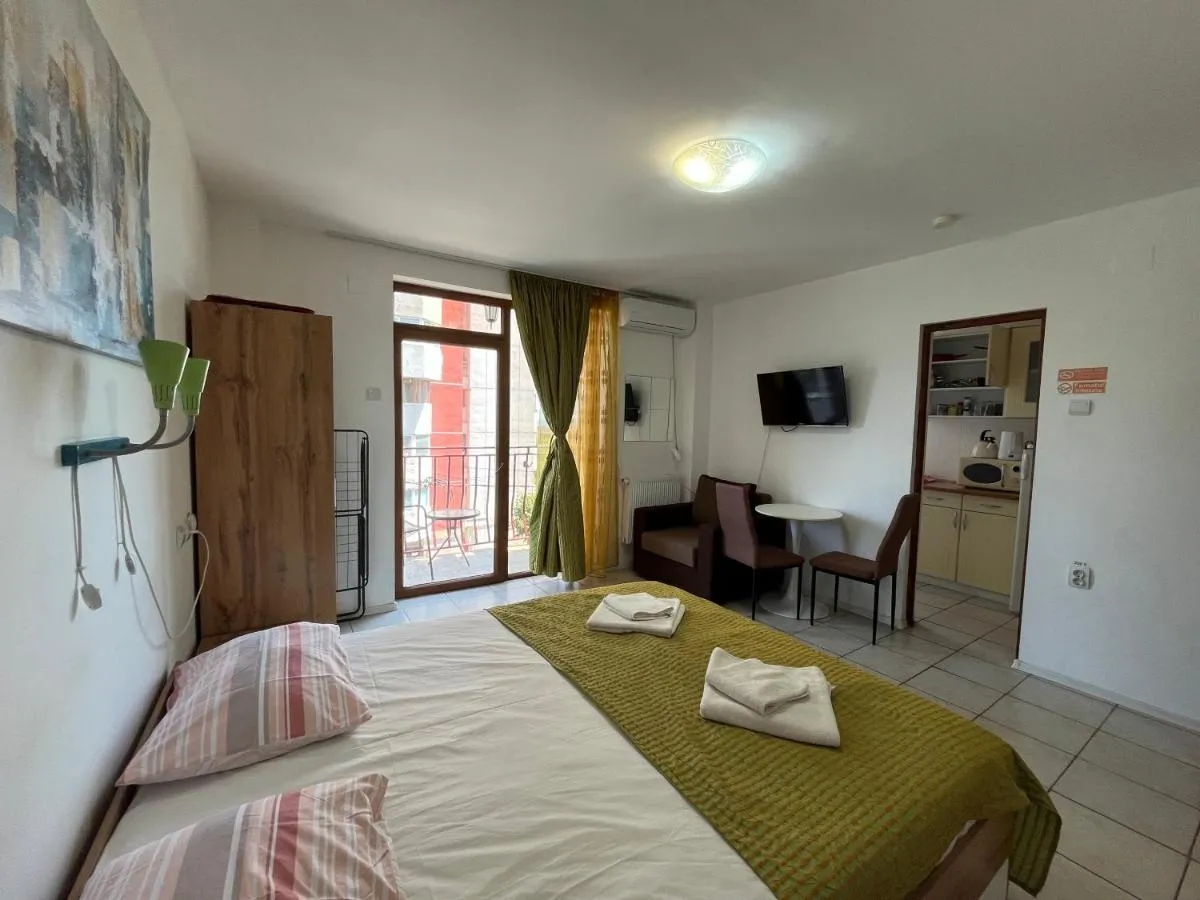 Dimensiuni: 30 mp Numar de camere: 1 camera Studioul are baie privată cu duș, uscător de păr și articole de toaletă gratuite. Bucătăria bine utilată include plită, frigider, ustensile de bucătărie și cuptor. De asemenea, studioul oferă facilități de grătar. De asemenea, acest studio are intrare privată, pereți izolați fonic, aer condiționat, TV cu ecran plat cu canale prin cablu, minibar și vedere la o stradă liniștită. Unitatea include 2 paturi.