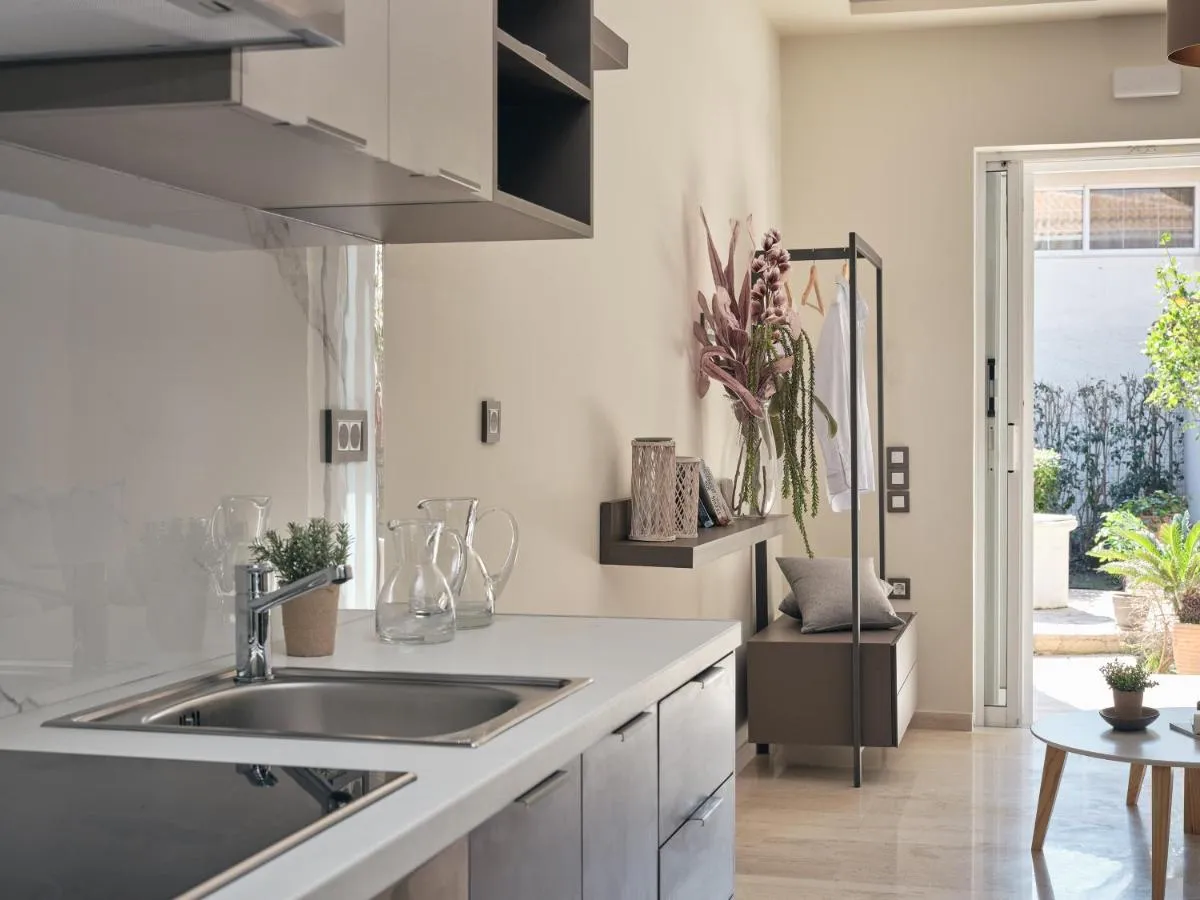 Dimensiuni: 60 mp Numar de camere: 4 camere This split-level maisonette offers a terrace, air conditioning and smart TVs on both floors. Fitted with a dining table and a fully equipped kitchen, the ground level features a sofa bed that turns to two single beds and 1 bathroom with shower . The first floor features a bedroom with a shower a double bed and a sofa bed that turns to two single beds, and a furnished terrace overlooking the lush garden and the pool.