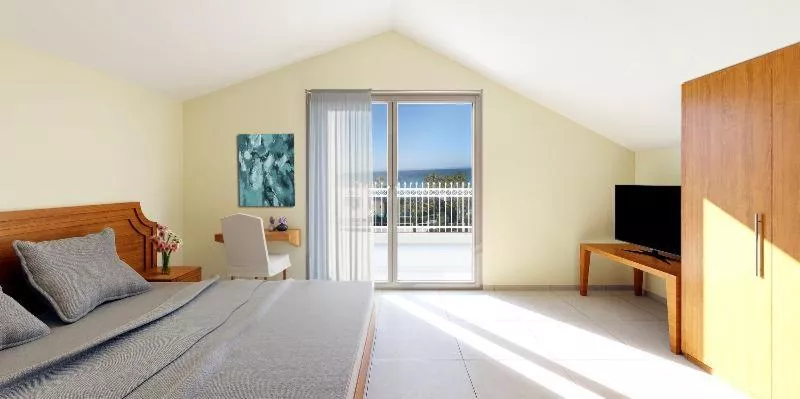 Dimensiuni: 44 mp Numar de camere: 5 camere Acest apartament oferă acces la o piscină infinită. Acest apartament are intrare privată, aer condiționat, 1 living, 1 dormitor separat și 1 baie cu duș și uscător de păr. Bucătăria este utilată cu plită, frigider, ustensile de bucătărie și aparat de ceai și cafea. De asemenea, apartamentul are pereți izolați fonic, TV cu ecran plat și canale prin satelit și terasă cu vedere la mare. Unitatea include 3 paturi. Baie privată cu duș
