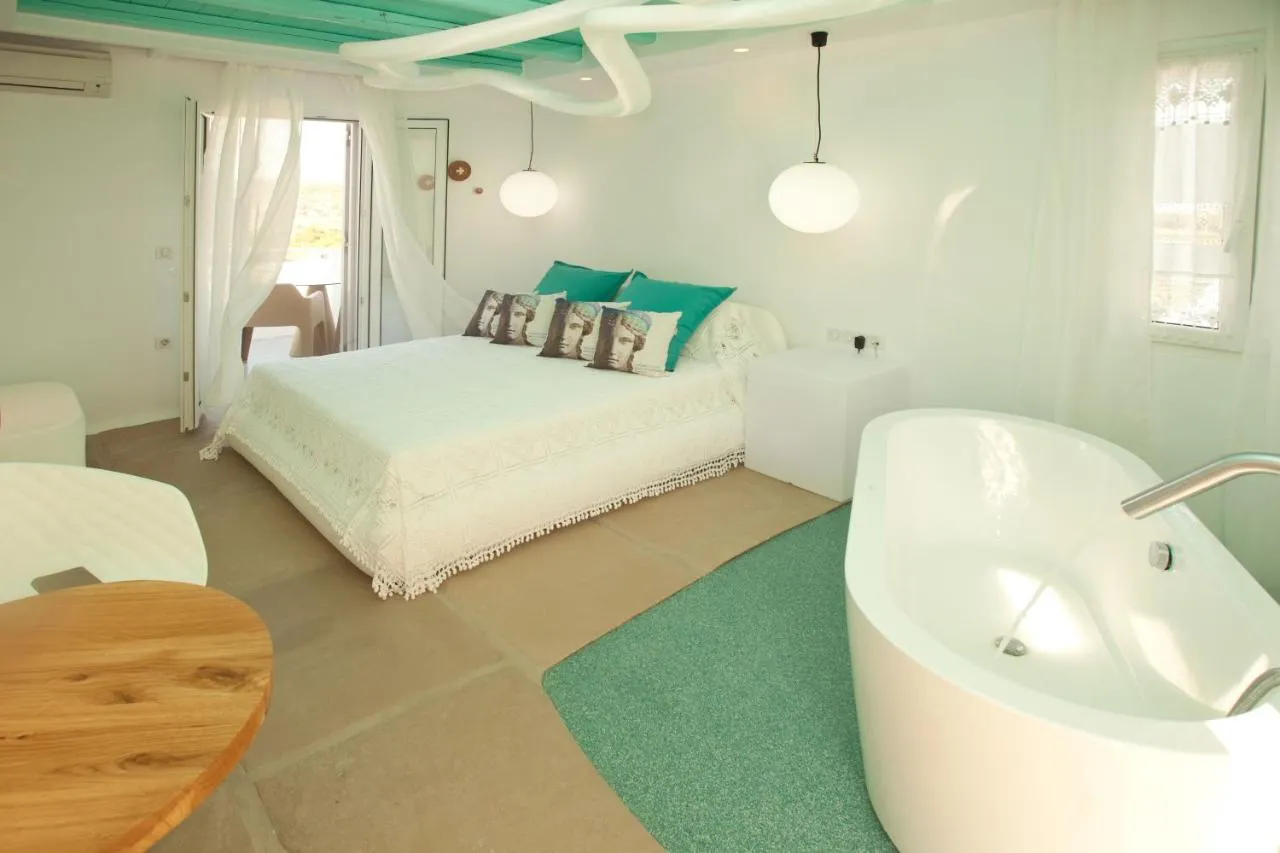 Dimensiuni: 30 mp Numar de camere: 3 camere Opening to a spacious terrace with hot tub and views over the Aegean Sea, this suite successfully combines modern and traditional Cycladic decor. It is fitted with Coco-Mat beds and unique decorative items and also includes:
