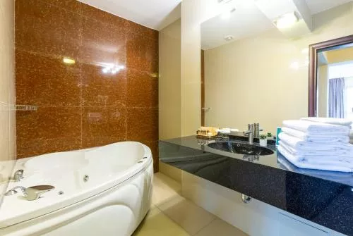 Dimensiuni: 56 mp Numar de camere: 1 camera Această suită spațioasă și elegantă oferă design modern, 1 balcon, o zonă de relaxare și o baie cu cadă spa și duș tip walk-in.