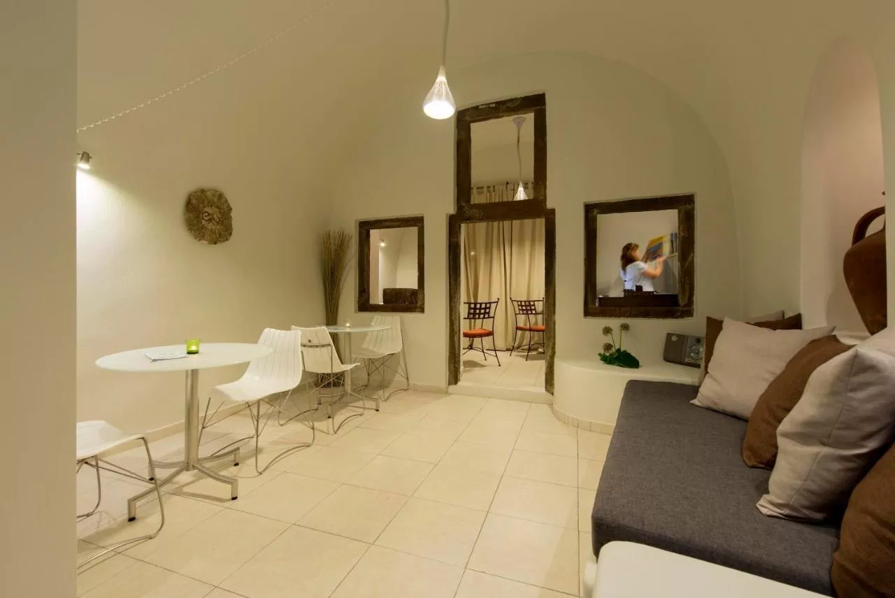 Dimensiuni: 25 mp Numar de camere: 2 camere This standard cave suite offers traditional accommodation which includes air conditioning, TV with SAT TV, CD/DVD player, safe, hairdryer, fully equipped kitchenette with mini fridge, direct dial phone, bathrobes and slippers, bathroom amenities and balcony or terrace with sitting area and a breathtaking view of the Caldera and the volcano.