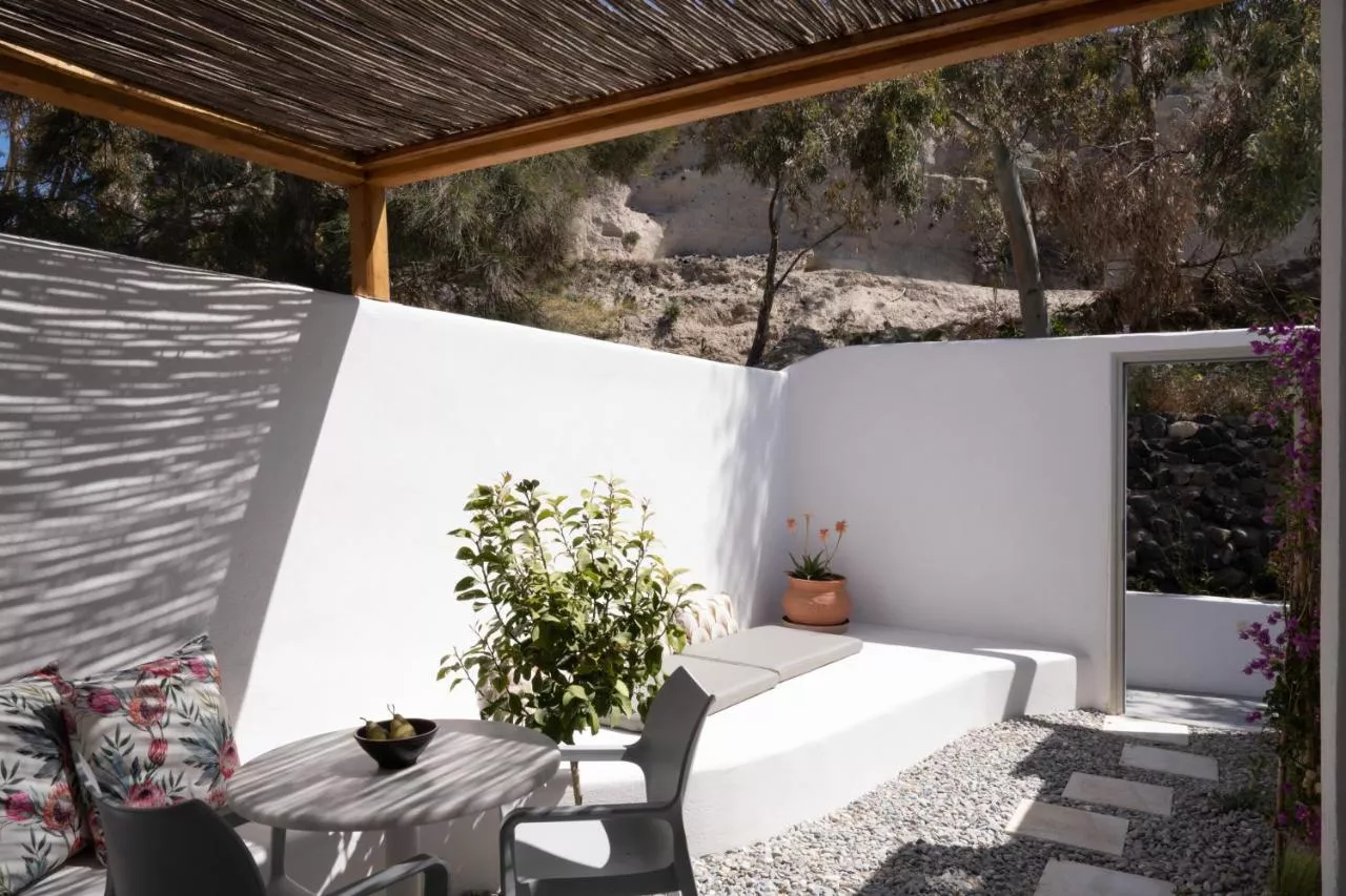 Dimensiuni: 20 mp Numar de camere: 3 camere Tastefully decorated and larger room with a smart TV, mini fridge and private bathroom with shower and hairdryer. It has a private veranda overlooking the garden and a shared, furnished veranda overlooking the Caldera. Baie privată cu duș