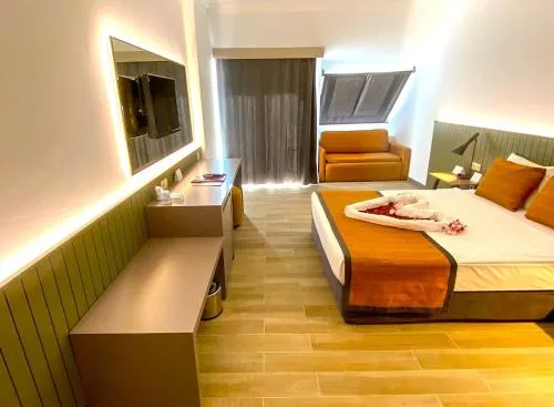 Camerele Hotelului Queen's Park Goynuk sunt mobilate modern și includ un televizor cu ecran plat, aer condiționat, minibar și balcon. Băile private sunt dotate cu cadă sau duș.