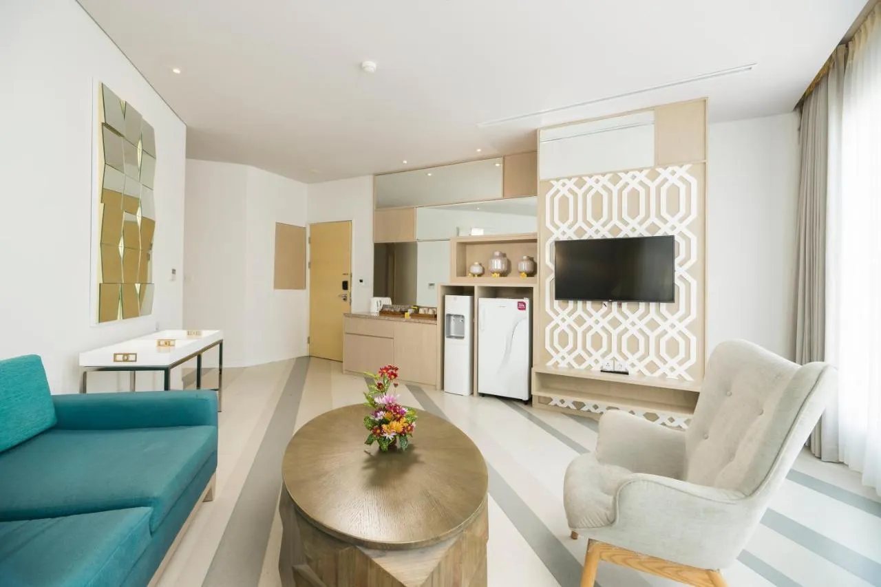 Dimensiuni: 60 mp Numar de camere: 3 camere This family-friendly suite is suitable for up to 5 persons and offers a balcony. In this 60-sqm unit, master bed and children's area are separated with a partition. En suite bathroom comes with a bath, a shower, and free toiletries. There is a flat-screen TV with international channels available.