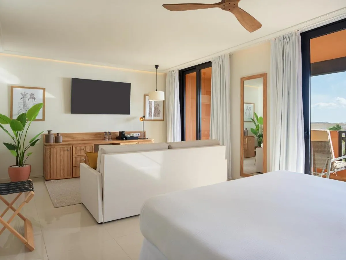 Dimensiuni: 34 mp Numar de camere: 2 camere Această cameră dublă este dotată cu aer condiționat și un balcon privat cu vedere laterală la mare sau la piscină. Aceasta are aparat de cafea sau fierbător. Oaspeții beneficiază de halat de baie și papuci.