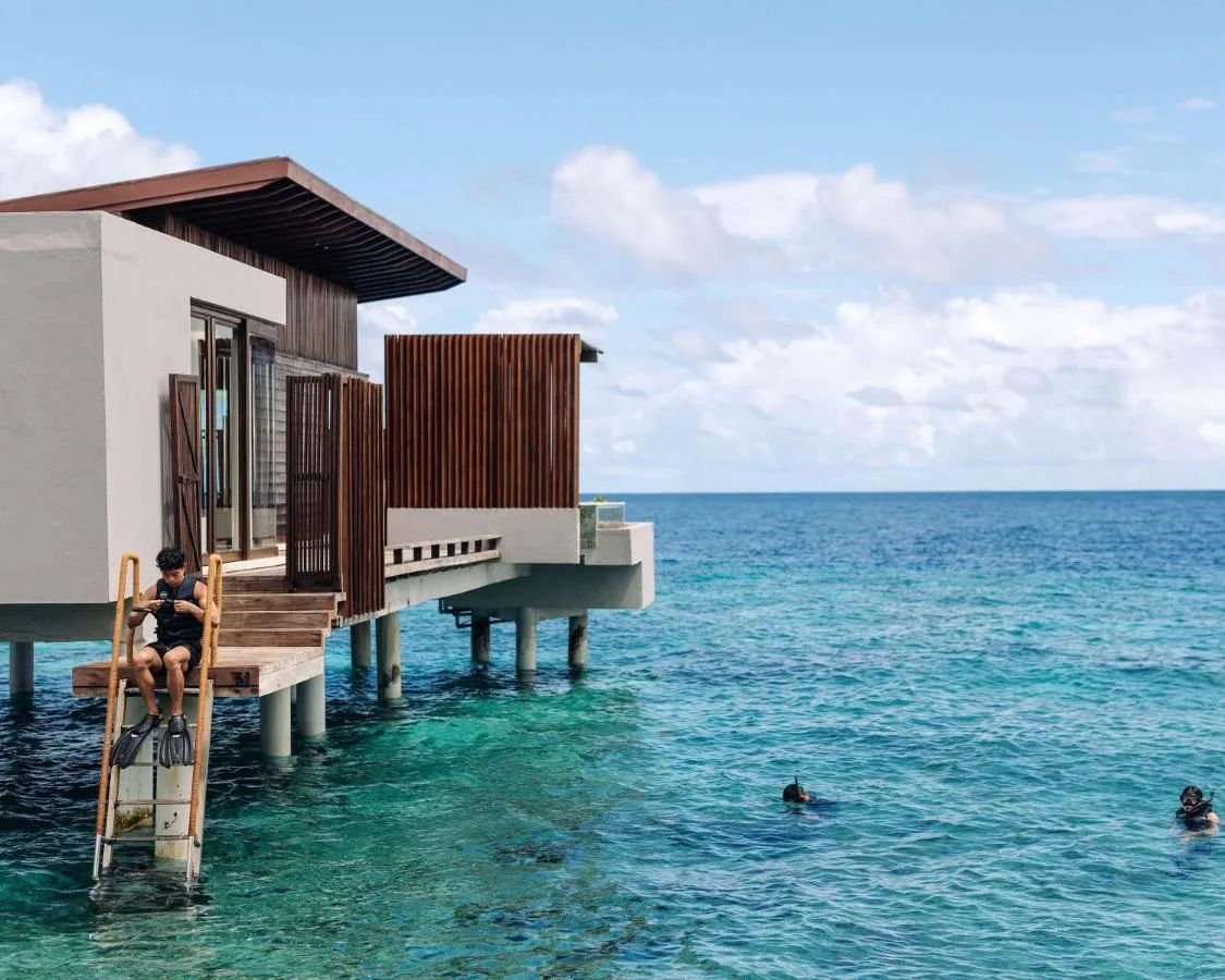 Dimensiuni: 115 mp Numar de camere: 1 camera The 115 sq m water villas with 180° views of the ocean, features a king bed, indoor bathtub, sun deck with daybed and direct access to the house reef.