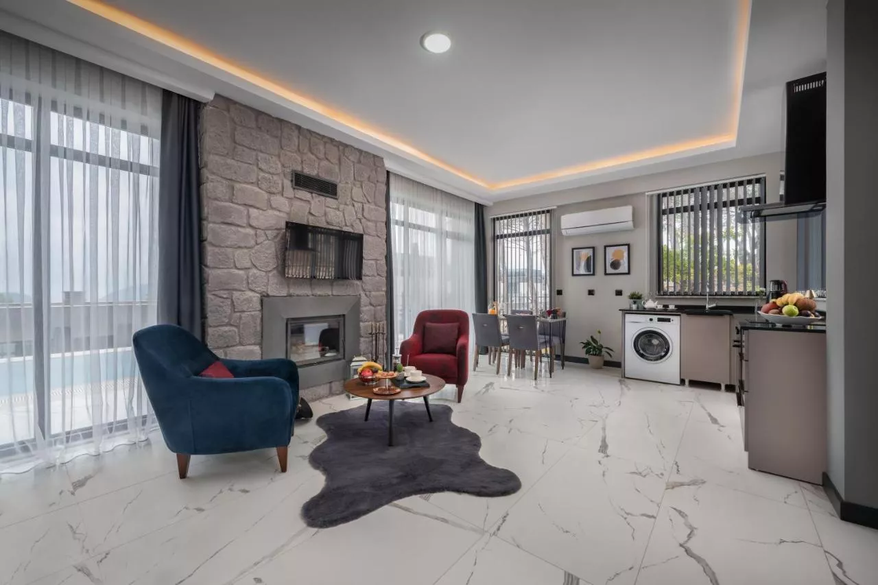 Dimensiuni: 60 mp Numar de camere: 5 camere Guests will have a special experience as this suite provides a fireplace. This spacious suite is comprised of 1 living room, 1 separate bedroom and 1 bathroom with a shower and free toiletries. The suite's kitchenette, which features kitchenware and an electric kettle, is available for cooking and storing food. The air-conditioned suite offers a flat-screen TV with cable channels, a washing machine, a minibar, a seating area as well as garden views. The unit offers 2 beds. Baie privată cu duș