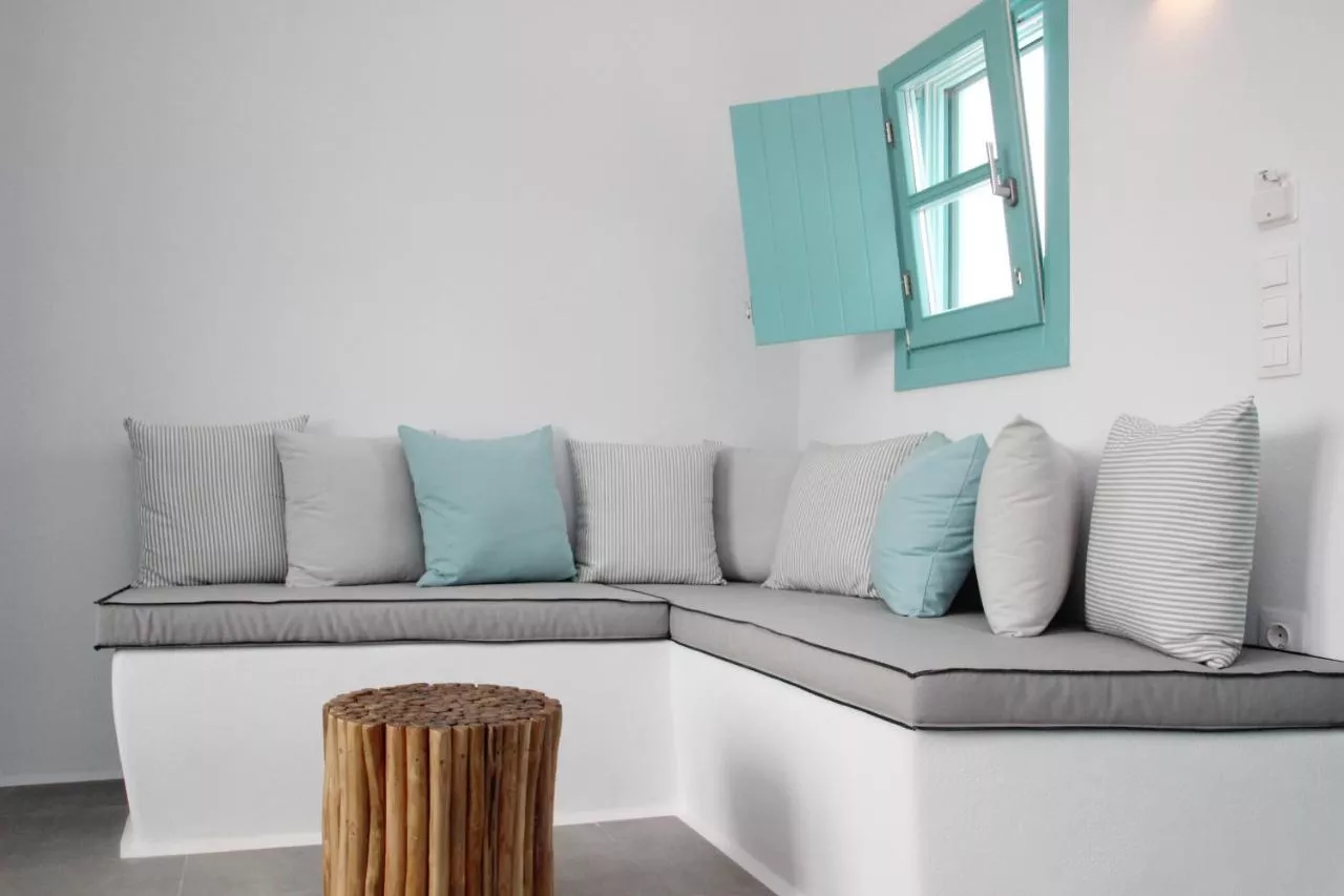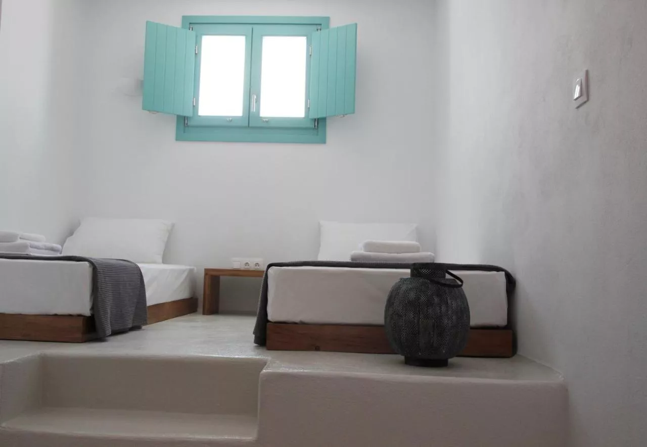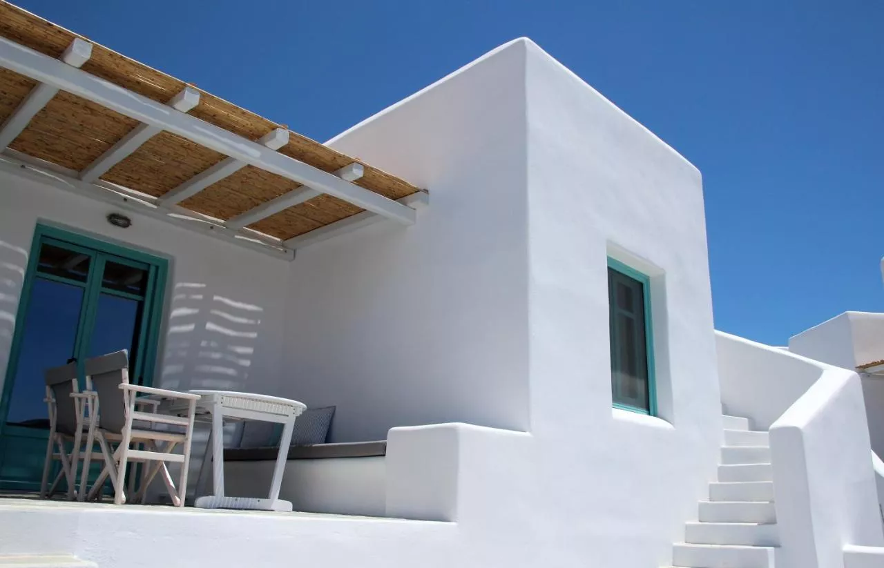 La doar 50 de metri de Plaja Plaka din Naxos, acest complex alb se compune din studiouri și case pe două niveluri, toate cu terasă privată și vedere la Marea Egee.
