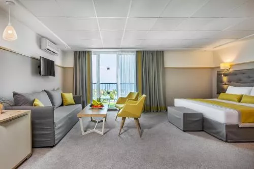 Dimensiuni: 45 mp Numar de camere: 1 camera The air-conditioned suite features 1 bedroom and 1 bathroom with a bath and a hairdryer. Featuring a balcony with sea views, this suite also provides a wardrobe and a flat-screen TV with satellite channels. The unit offers 2 beds. Baie privată cu cadă