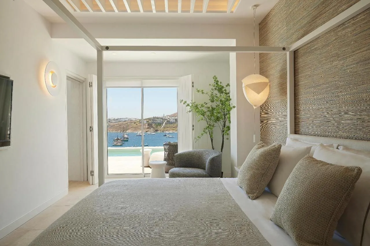 Suitele din hotel sunt echipate cu o terasă cu vedere la Marea Egee, mașină de cafea și frigider. Unele camere au propriul lor bazin privat.