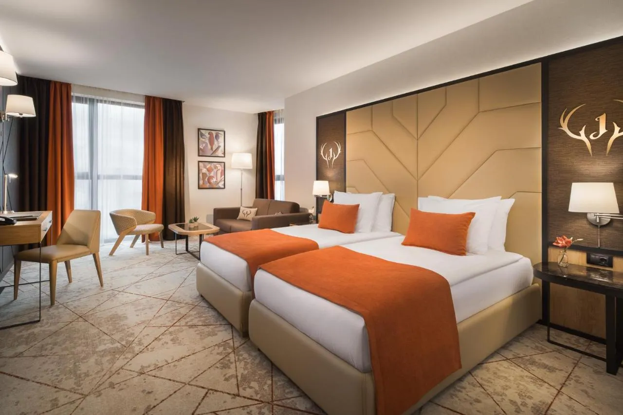 Dimensiuni: 31 mp Numar de camere: 2 camere Camera dublă include baie privată cu duș, uscător de păr, papuci de casă și articole de toaletă gratuite. De asemenea, această cameră dublă este spațioasă și are pereți izolați fonic, aer condiționat, TV cu ecran plat și canale prin cablu, minibar, aparat de ceai/cafea și vedere la oraș. Unitatea de cazare include 2 paturi.