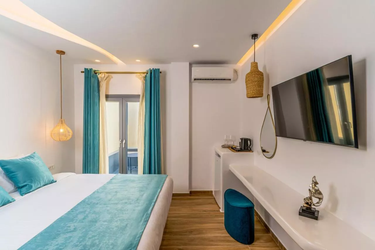 Oaspeții pot experimenta o adevărată vacanță în Santorini, cazându-se într-o cameră în stil tradițional cicladic. Camerele oferă multe facilități pentru confort.