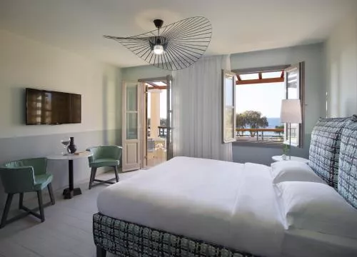 Dimensiuni: 36 mp Numar de camere: 10 camere Located in the main building, the luxury rooms feature one elegantly decorated bedroom with pouf-bed or armchair bed, a bathroom with separate walk-in shower, freestanding bathtub, separate wc, air conditioning/heating, electronic safe deposit box, mini-bar, satellite TV, magnifying mirror, hairdryer, slippers, bathrobes, toiletries and a balcony that offers a breathtaking view of the sea. Available with a choice of king or twin luxury beds. Private bathroom with bath