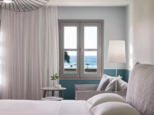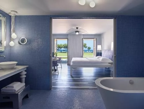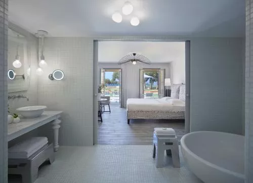 Dimensiuni: 112 mp Numar de camere: 1 camera Situate în clădirea principală, suitele de familie sunt spațioase și au design unic și terasă complet mobilată, cu șezlonguri și umbrelă, oferind vedere panoramică la mare și la piscină. Acestea au 2 dormitoare: dormitor matrimonial cu pat king-size, al 2-lea dormitor cu paturi twin, o cameră de toaletă în living, 2 băi private, ambele cu căzi de sine stătătoare și duș tip walk-in separat, dressing și un lounge mare separat, cu zonă de luat masa. Suitele au aer condiționat/încălzire controlată individual în fiecare cameră, 3 televizoare prin satelit, seif electronic, minibar, oglindă cosmetică, uscător de păr, papuci, halate de baie și articole de toaletă.