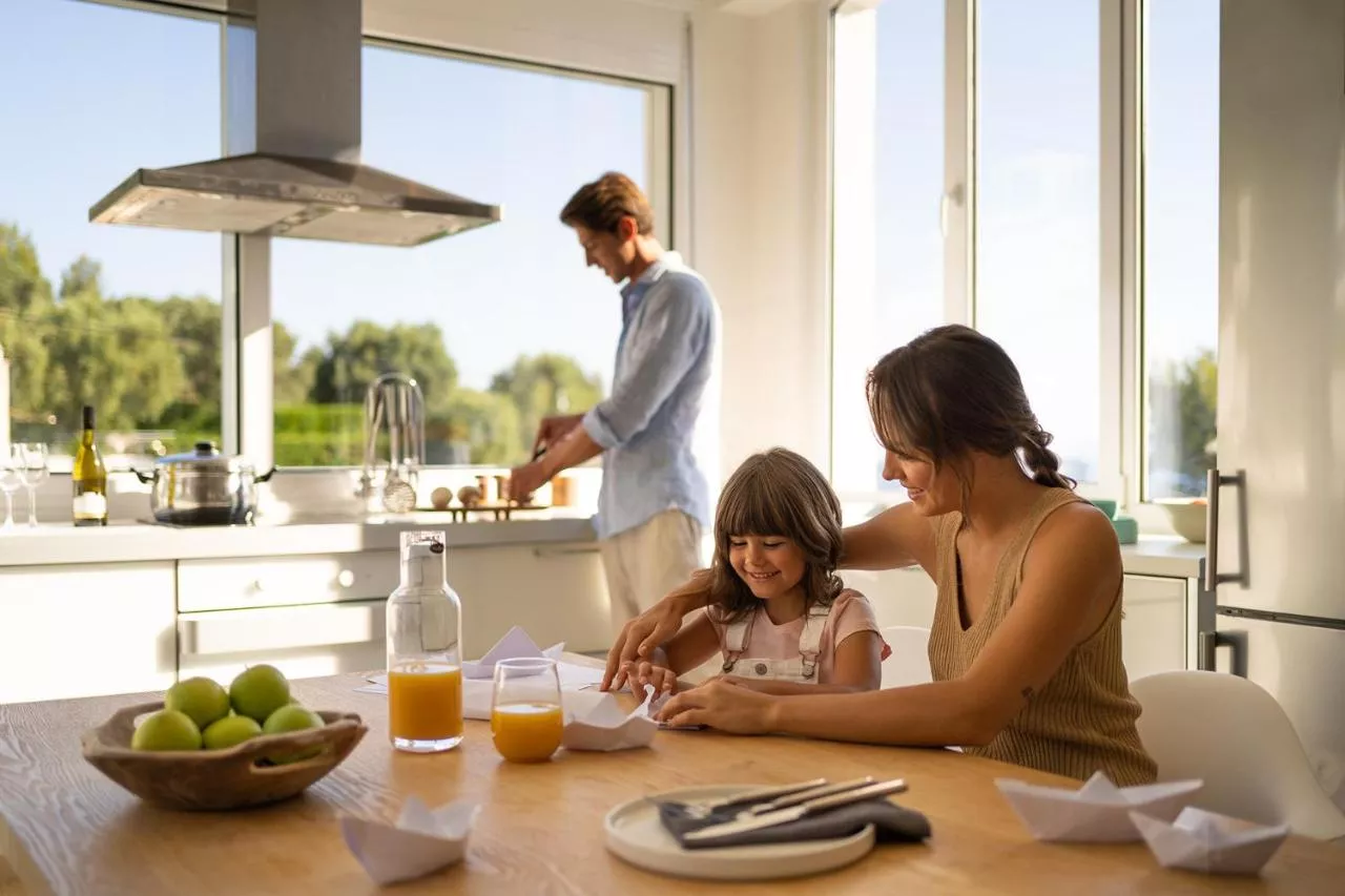 - o bucătărie complet utilată, cu zonă de luat masa și cuptor cu plite