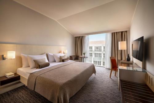 Baie: Halat de baie Prosoape Articole de toaletă gratuite Papuci de casă Cadă sau duş Uscător de păr Hârtie igienică Baie privată General : Seif Fier de călcat Facilităţi de călcat Încălzire Aer condiţionat Media/Tehnologie: TV cu ecran plat TV Telefon Canale prin satelit Servicii: Serviciu de trezire Exterior: Mobilier de grădină Balcon Facilităţile camerei: Priză lângă pat Vedere: Vedere Dormitor: Lenjerie de pat Garderobă sau dulap Mâncăruri și băuturi: Minibar Bucătărie: Cană fierbător