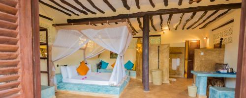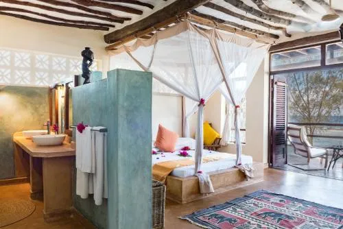 Dimensiuni: 40 mp Numar de camere: 5 camere Găzduită de un bungalou înconjurat de o grădină luxuriantă, această cameră are balcon sau verandă cu vedere directă la ocean, decor în stil Zanzibari, pat king size cu plasă de țânțari, birou, bancă de piatră, seif, ventilatoare și dulap. Baia privată este dotată cu duș.