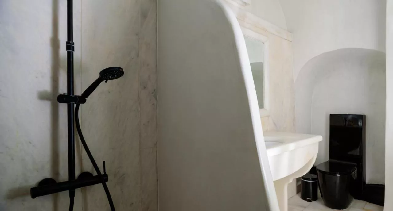 Bathroom with shower head offering amazing caldera views. Baie privată cu cadă