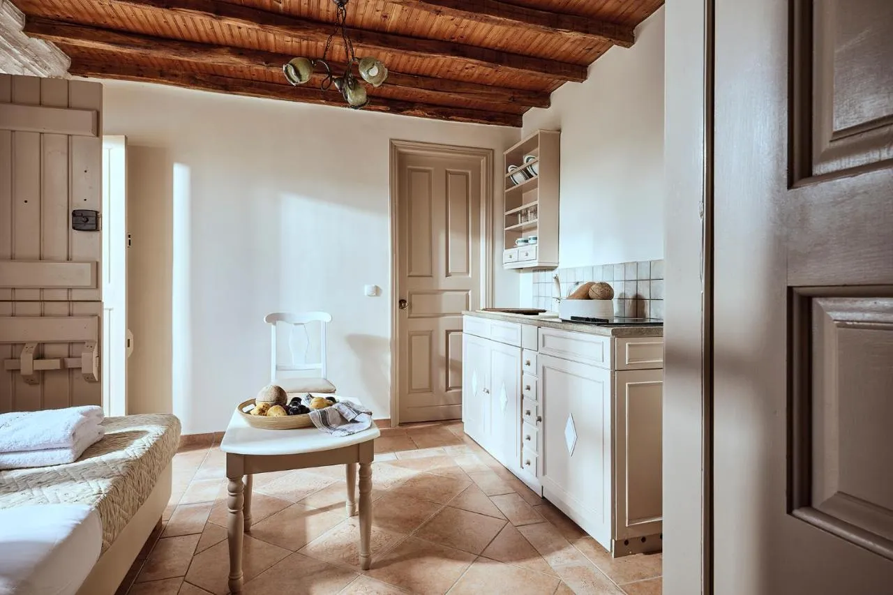 Decorate tradițional cu tavan cu grinzi, toate camerele și suitele se deschid către un balcon sau o terasă cu vedere la Marea Egee sau la grădină. Fiecare este dotată cu un frigider mini, televizor prin satelit și uscător de păr.
