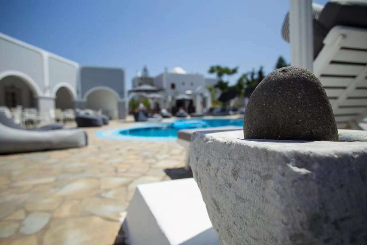 Frumoasa piscină a Maistros Village, cu șezlonguri și umbrele, este locul ideal pentru relaxare. Gustări și băuturi răcoritoare sunt servite la barul de la piscină.