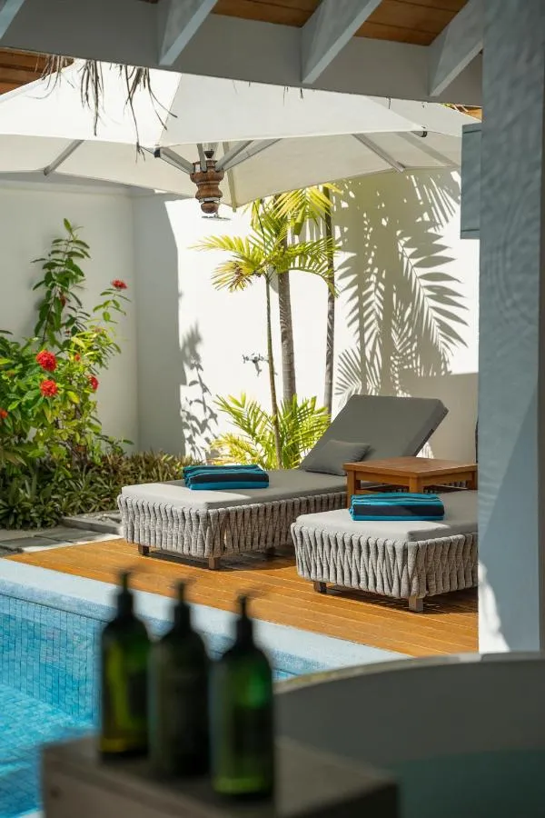 Dimensiuni: 175 mp Numar de camere: 1 camera Unitatea de cazare pune la dispoziție un dormitor mare pe două niveluri, o baie spațioasă și o piscină de relaxare extinsă. Spațiul dintre veranda vastă și foișorul cu stuf de lângă piscină este dominat de tonuri naturale simple. Oaspeții se bucură de un cadru intim elegant, cu duș în grădina din curte și zonă de luat masa lângă piscină. Se asigură serviciu de majordom personal. Această cameră poate găzdui 3 adulți sau 2 adulți și 2 copii. În cazul rezervărilor în regim dublu, oaspeții suplimentari pot fi cazați contra cost.