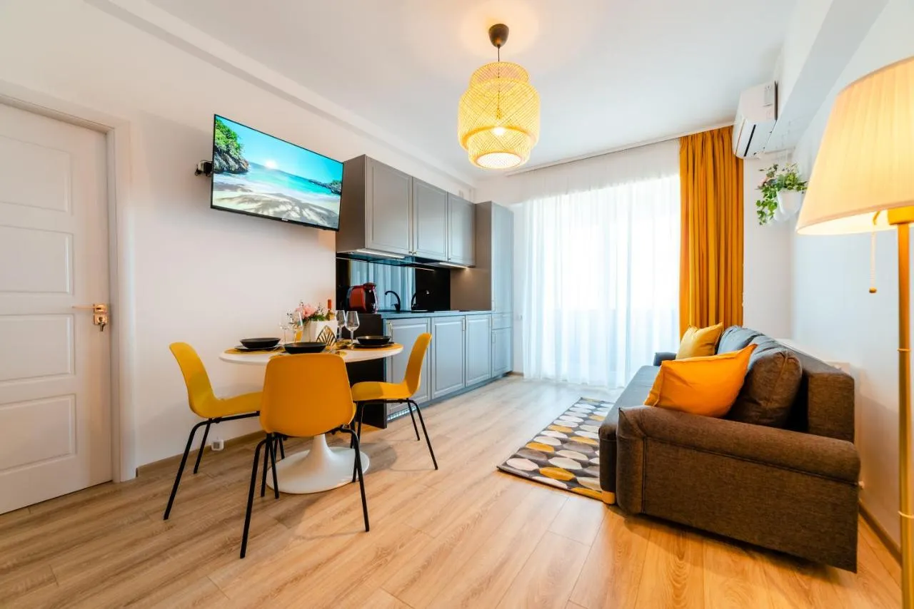 Dimensiuni: 53 mp Numar de camere: 2 camere The air-conditioned apartment has 1 bedroom, 1 bathroom, a kitchen and a dining area. The apartment's kitchen, which features a tea and coffee maker, is available for cooking and storing food. Boasting a balcony with sea views, this apartment also features a washing machine and a flat-screen TV with cable channels. The unit has 2 beds.