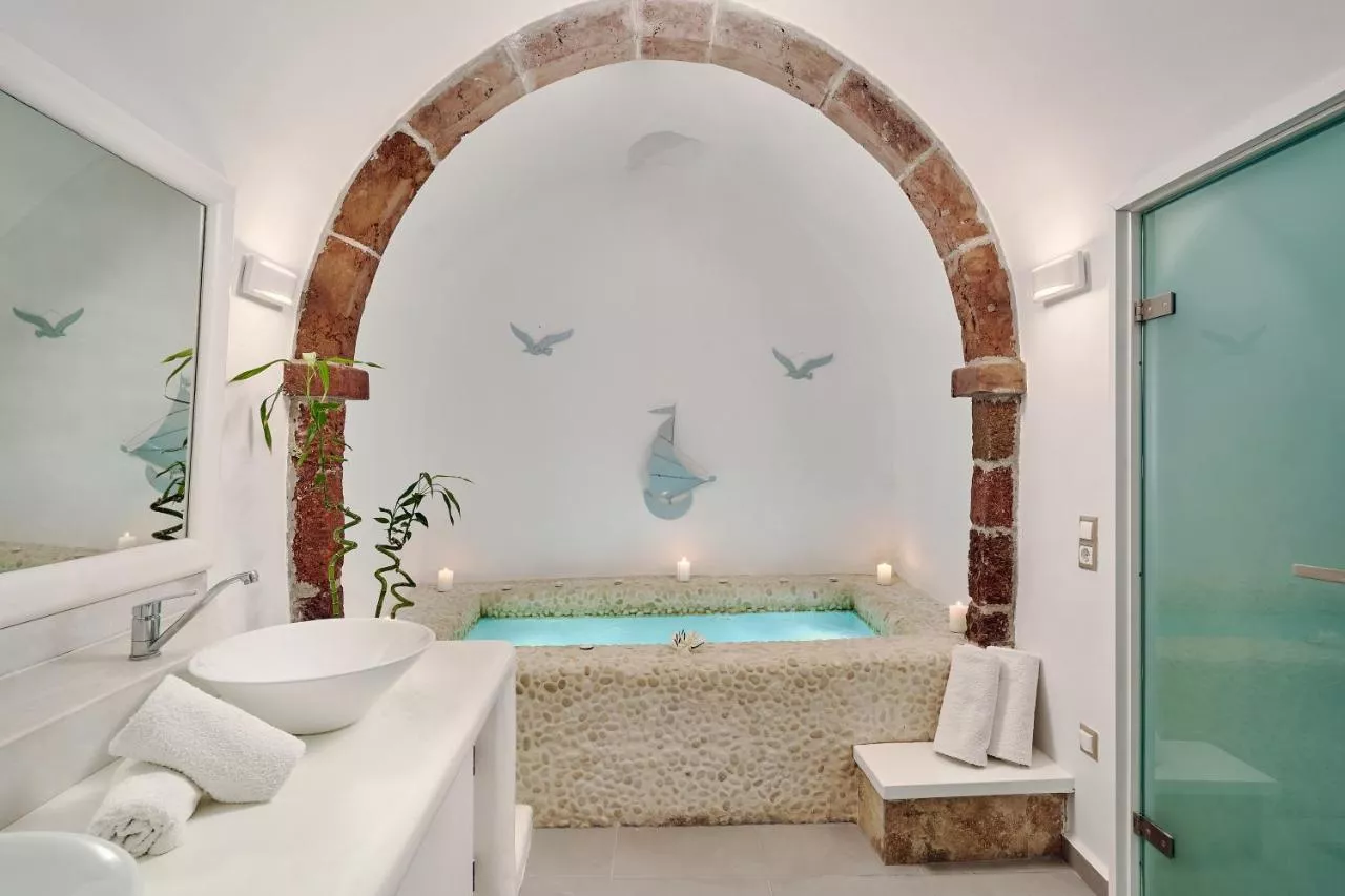 Dimensiuni: 55 mp Numar de camere: 2 camere Cave-like structured room features a private bathroom with spa bath and views of the caldera, the volcano and the Aegean Sea.