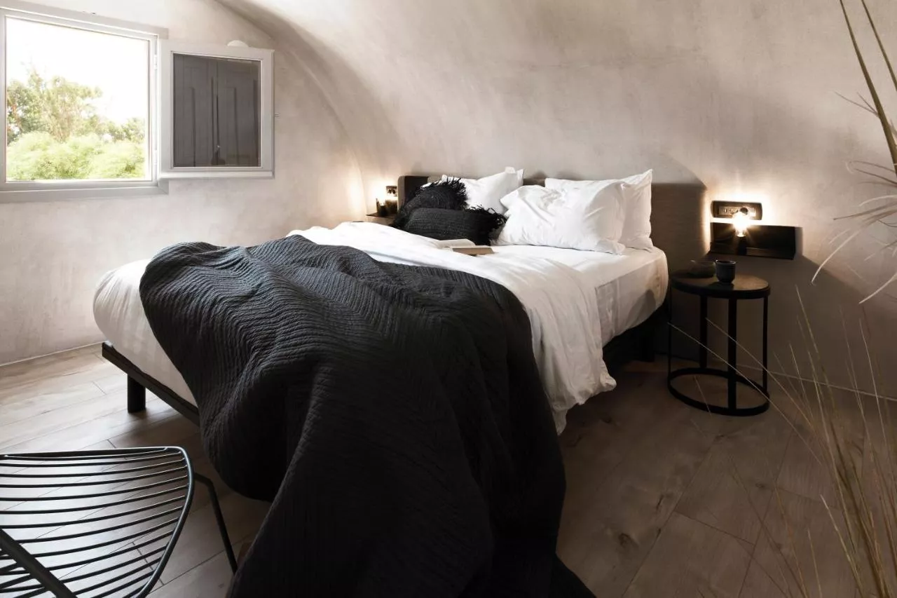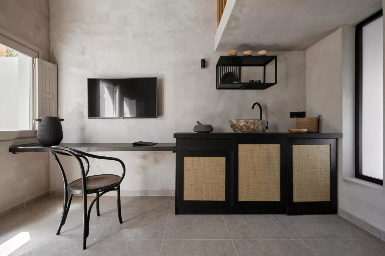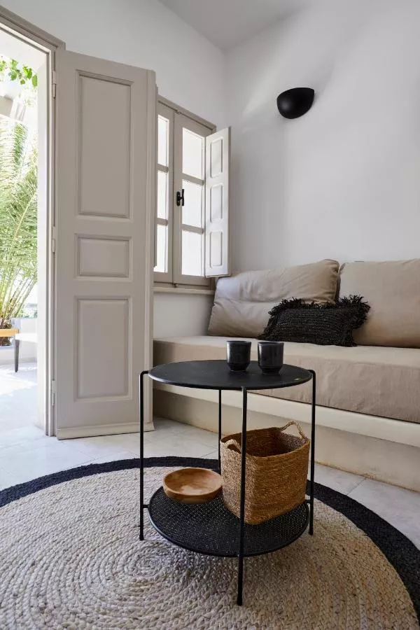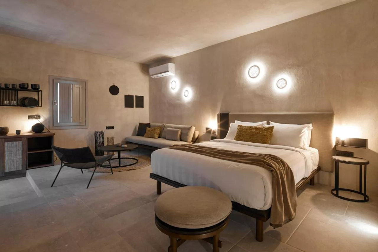 Hotelul are simplitatea decorului cicladic tradițional și o atmosferă relaxată care reflectă stilul de viață al insulei.