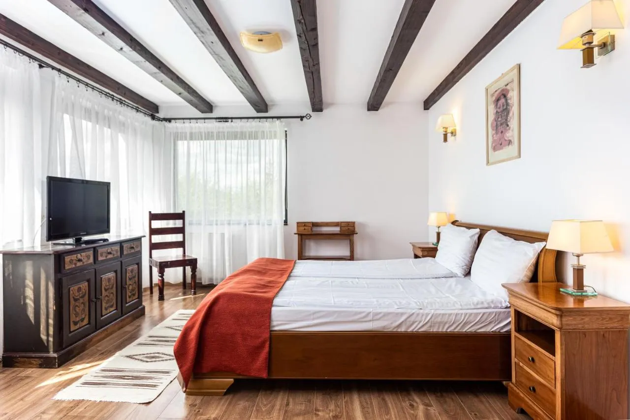 Dimensiuni: 40 mp Numar de camere: 1 camera Suită mare, formată dintr-un dormitor cu un pat dublu, o zonă de living cu canapea și o terasă privată cu vedere la munte. Facilitățile includ TV prin cablu, frigider și baie privată.
