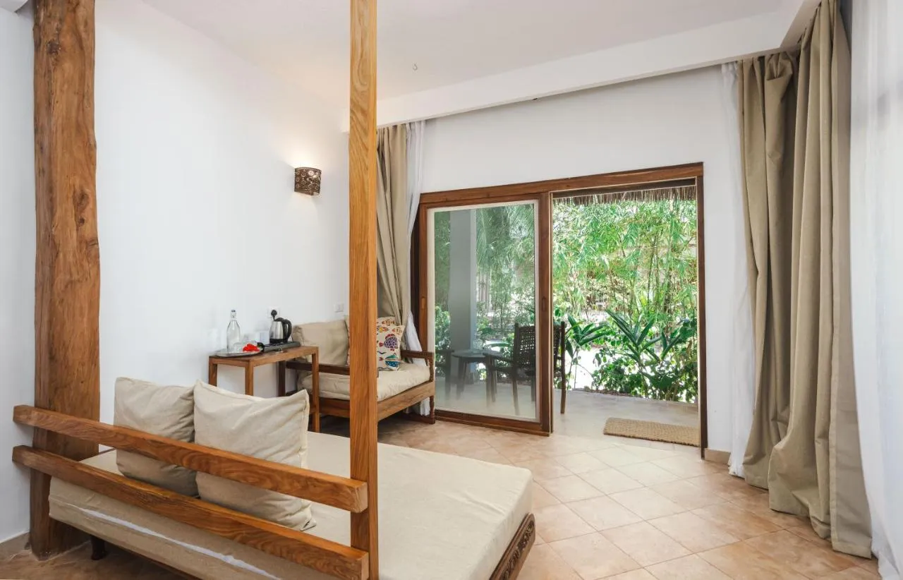 Dimensiuni: 32 mp Numar de camere: 1 camera This ground floor sea view room has a furnished outdoor terrace with direct access to the beach and can accommodate up to 2 people. It is decorated in a bright, modern Swahili style with sea view and has an en-suite bathroom with a shower and bidet.