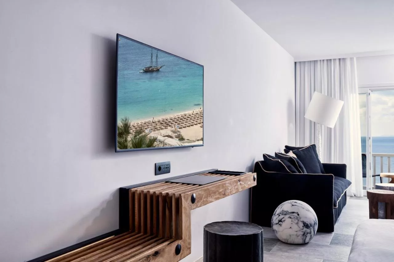 Cu vedere la propria plajă de nisip, luxosul Royal Myconian - Leading Hotels of the World se mândrește cu camere elegante cu vederi spectaculoase la Marea Egee și facilități spa extinse.